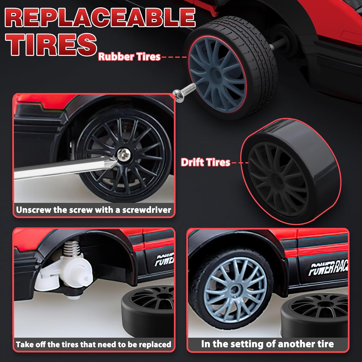 - Rechargeable Fast Car: Full function RC drift car with two rechargeable batteries. Don't worry about being out of charge anymore; Forward, reverse, left/right turn, front LED lights, U shaped drift, fiqure 8 drift, all-wheel drive