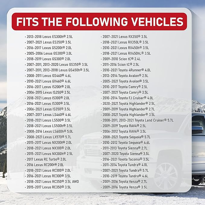 - COMPATIBLE WITH LEXUS, SCION & TOYOTA VEHICLES With 6 Cyl 3.5L Engine - 2013-2018 ES300h 2.5L | 2007-2021 ES350 3.5L | 2016-2017 GS200t 2.0L | 2018-2019 GS300 2.0L | 2007-2011, 2013-2020 GS350 3.5L | 2010-2021 4Runner 4.0L | 2005 - 2021 Avalon 3.5L | 2007-2021 Camry 3.5L | 2008-2021 Highlander 3.5L | 2008-2011, 2013-2021 Land Cruiser 5.7L | 2009-2019 RAV4 2.5L | 2008-2021 Sequoia 5.7L | 2007-2021 Tundra 5.7L | 2009-2016 Venza 3.5L & more. See below for a full vehicle list.