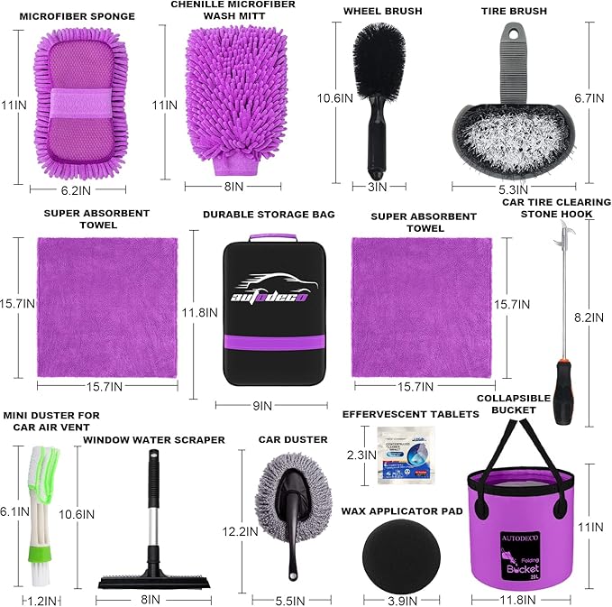 - 22PCS PURPLE CAR WASH CLEANING KIT: 1 portable collapsible bucket(20L/5 Gallon), 1 extra large chenille microfiber wash mitt(8'' x 11''), 1 microfiber wash sponge, 2 super absorbent towel(15.7"*15.7"), 1 window water scraper, 1 car tire brush, 1 car wheel brush with handle, 1 mini duster for car air vent, 6 glass washer cleaning pieces, 1 car tire clearing stone hook, 1 car duster, 4 wax applicator pad, 1 black storage zipper bag with purple printing