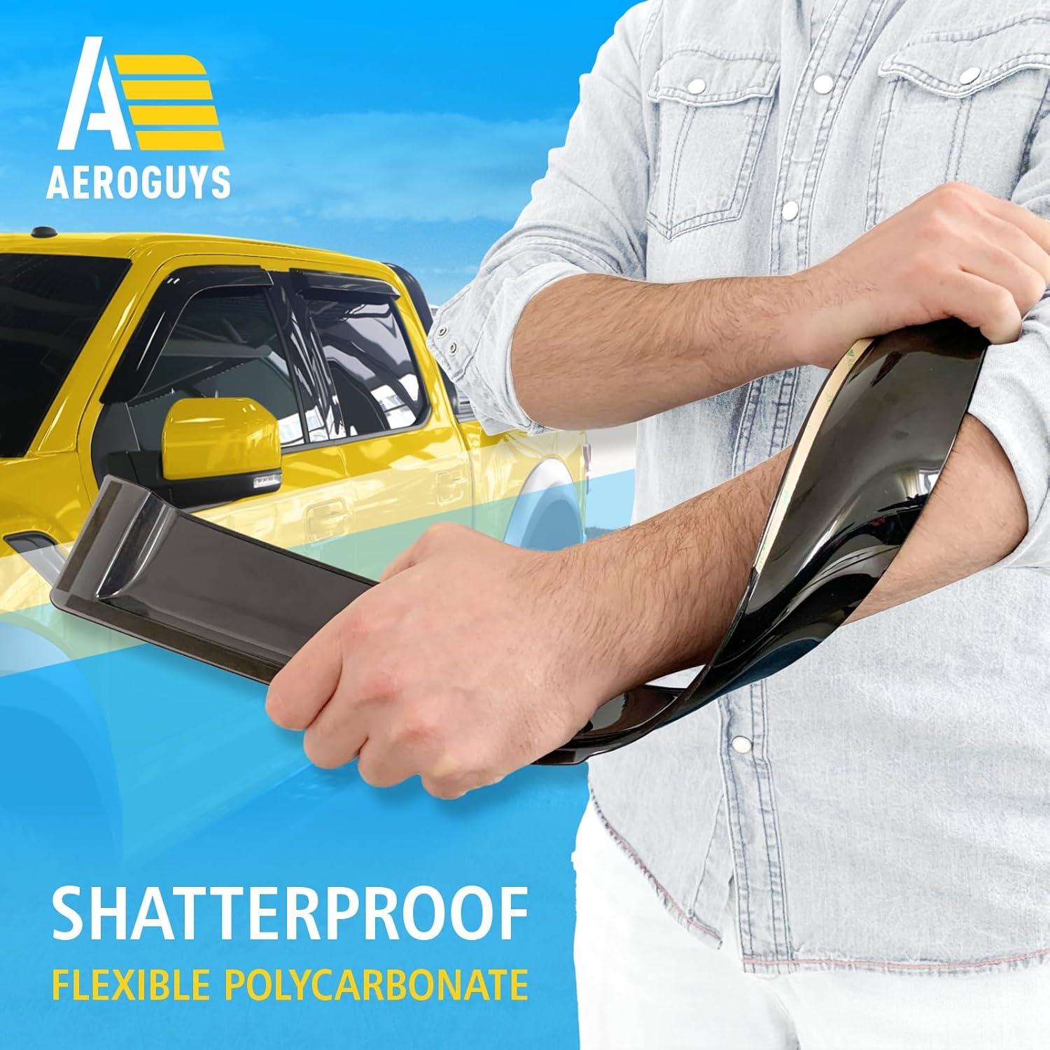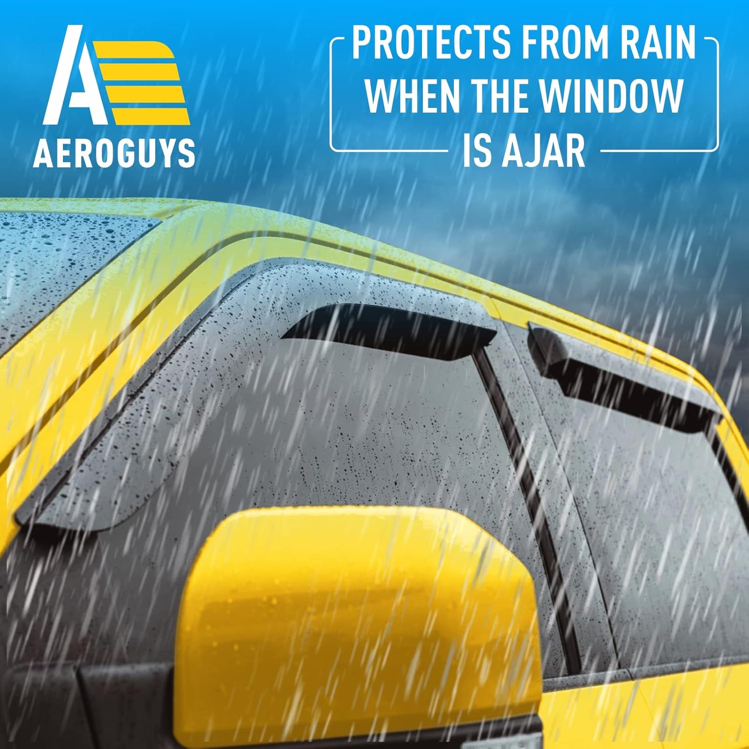 - No Tools Needed, Quick and Easy Assembly β These rain guards are very easy to fit. TAPE-ON INSTALLATION provides perfect fit for your truck. Just slip it onto your carβs window and your job is done within minutes. There is no drilling or no tools required. Be sure that AEROGUYS window deflectors are water resistant, sun protective and will not bend, break or crack regardless of the weather conditions.