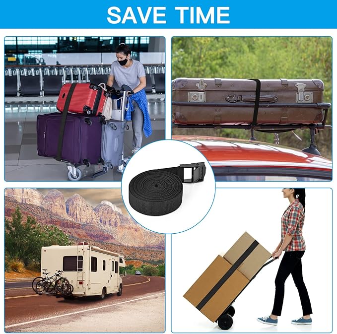 - Easy TO USE: Cam buckle straps with quick-release cam buckle, no need to tie knots, which can be fixed or loosened within a few seconds, saving you time for knotting. Just press and hold the fastener to adjust the belt length, it is your best choice for travel and freight
