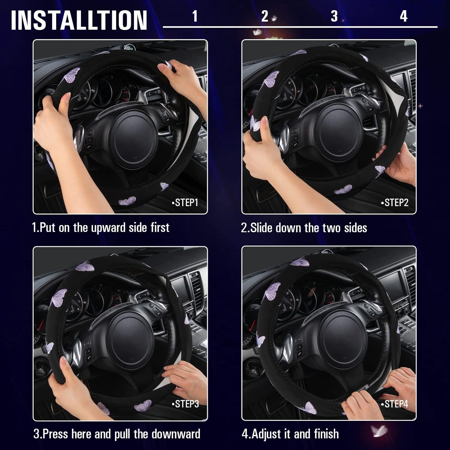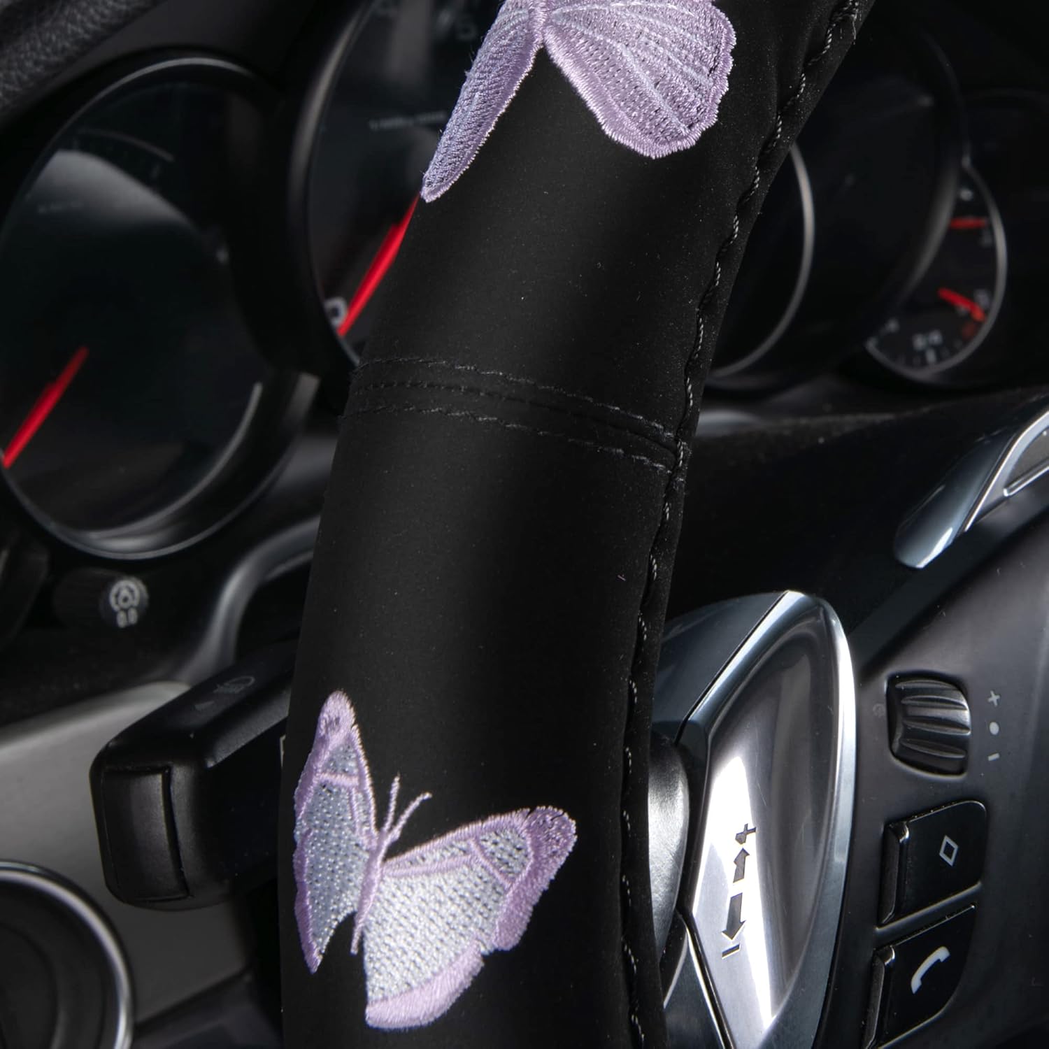 - EXQUISITE BUTTERFLY ON THE SURFACE OF STEERING WHEEL COVER-Feel Very comfortable when driving.Protect your hands from burning hot steering wheels in summer and ice cold ones in winter.