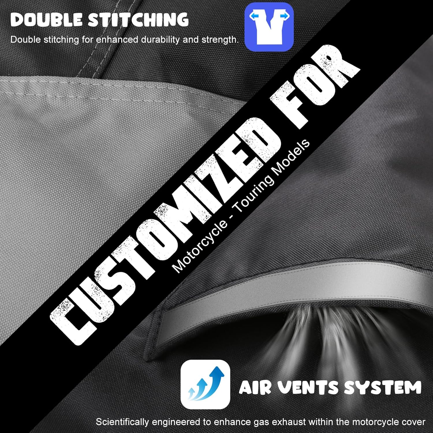 - Suitable for Most Motorcycle Touring: 107 "L x 39" W x 55 "H stereo cutting, and the widened rear cover design is suitable for most rear side boxes and motorcycle touring, such as Harley Davidson/Indian/Honda/BMW Touring Models.