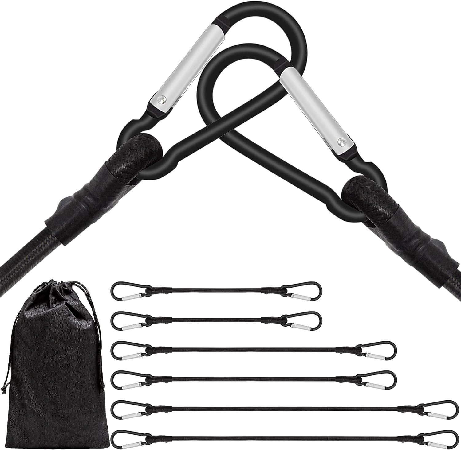- Bungee Cords Carabiner Assorted Size: 6 pack bungee cord hooks in 3 length, 24" 40" 60",. It has an advantage in both length and width over ordinary bungee cords. It has stronger carrying capacity and can meet your higher requirements. These heavy duty bungee cords are highly elastic and supportive and are compatible with bags of all sizes and weights. Compatible with all bikes, cars, carts, luggage racks, camping, gardening, clotheslines.