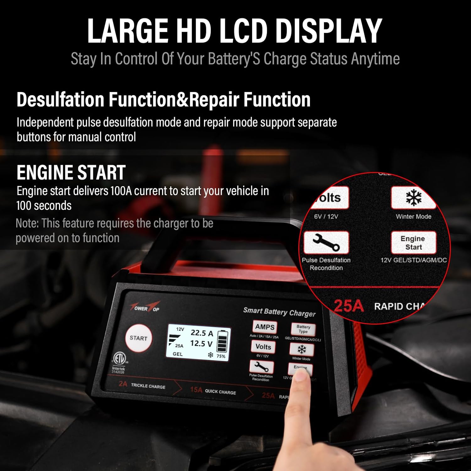 TowerTop 2/15/25 Amp Car Battery Charger, 6V/12V Fully Automatic Smart Battery Maintainer with Engine Start, Auto Desulfator, Battery Repair, Winter Mode, for All Lead-Acid and LiFePO4 Batteries