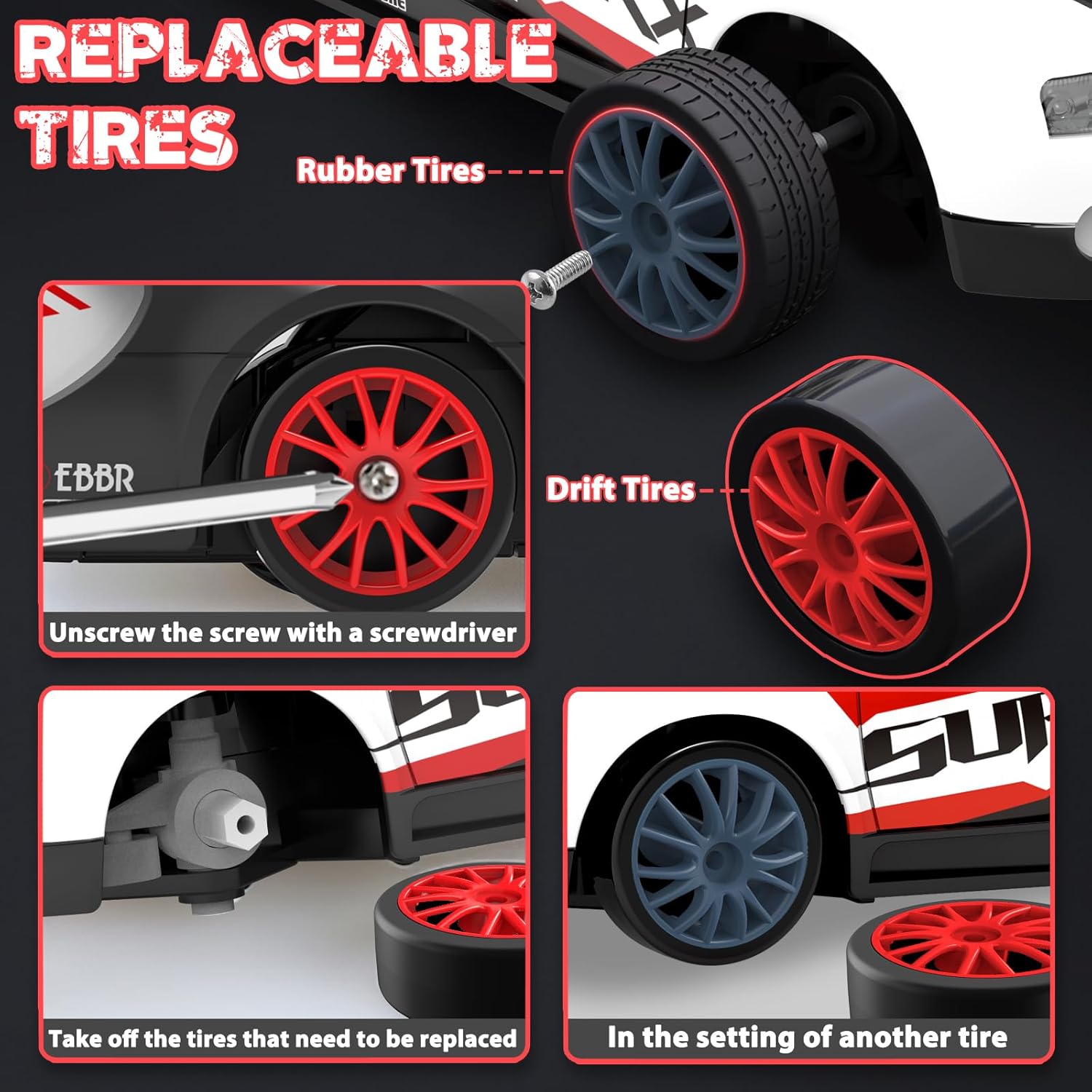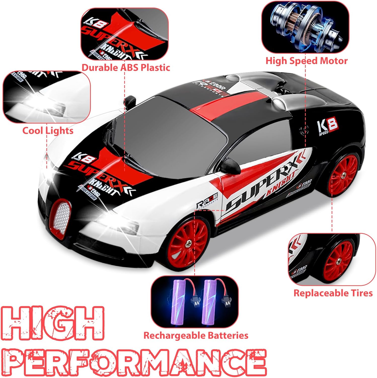 - Rechargeable Fast Car: Full function RC drift car with two rechargeable batteries. Don't worry about being out of charge anymore; Forward, reverse, left/right turn, front LED lights, U shaped drift, fiqure 8 drift, all-wheel drive