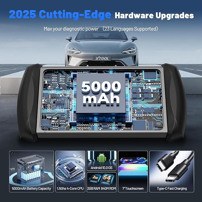 - 2025 Upgraded Hardware for Premium Performance: This OBD2 scanner features upgraded chip 4-core CPU, 2GB RAM and 64GB ROM, 5000 mAh battery (with 2500m Ah 7.3V fast charging), 7" touchscreen for better view of live data. Say goodbye to slow and delayed feedback. V2.0 UI brings you smoother operation and boost the efficiency of car diagonostics significantly