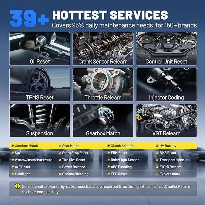 - 39+ Reset Service for 95% of Repair Requirements: The XTOOL IP819 consolidates over 39 critical services into one affordable obd2 scanner diagnostic tool, including Oil Reset, ABS Bleeding, TPMS Reset, EPB reset, BMS reset, HV battery, power balance, SAS, A/C relearn, throttle, headlight, suspension, Injector Coding, Gearbox Match, Tire Size Reset, Crank Sensor Relearn, Coolant Bleeding and more. Efortlessly resolve 95% of maintenance issues with XTOOL IP819
