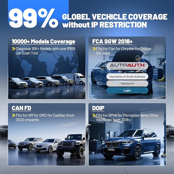- Wide Range Models Coverage & 2025 Globel Version: The IP819 bi directional scan tool supports DoIP & CAN FD protocols, and FCA AutoAuth for 2018+ Chrysler, covering 10,000+ vehicles across the USA, Europe, Asia, and Australia. With newly upgrade 23+ languages (including spanish) and 3 years of f.ree updates, this car scanner diagnostic tool is built to grow with your needs. TIPS: If you got issues with changing language, just provide the S/N of your IP819 and reach out to us