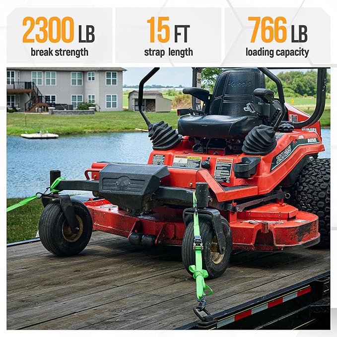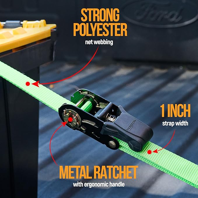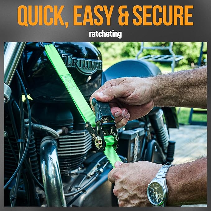 - Multifunctional – Tie down straps ratchet mechanism offers durability and security to transport a variety of objects. Securely tie down your motorcycle, bike, kayak, UTV, boat, ATV, boxes, boat, cooler, & other cargo via trailers, or car roof rack.