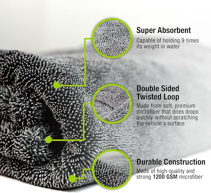 - 1 TOWEL DRIES THE WHOLE CAR: Dry your entire car or truck in just one stroke with this super soft twisted loop microfiber drying towel - no wringing out required! We call it Mega because it absorbs more water than other drying towels, which means no streaks, no smears, and no spots! Just a more efficient and effective drying experience and a clean, shiny vehicle.