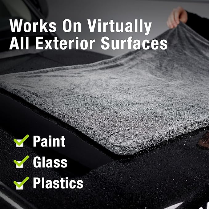 - DITCH THE NASTY RAG: Stop wasting paper towels. End the nuisance of using multiple rags that end up sopping wet or leave streaks behind. Don’t let all that washing effort go to waste. Double down on premium microfiber to absorb water and achieve a flawless finish on your vehicle. This large drying towel is 24” x 36”, edgeless, and double sided for a smooth and luxurious drying experience.