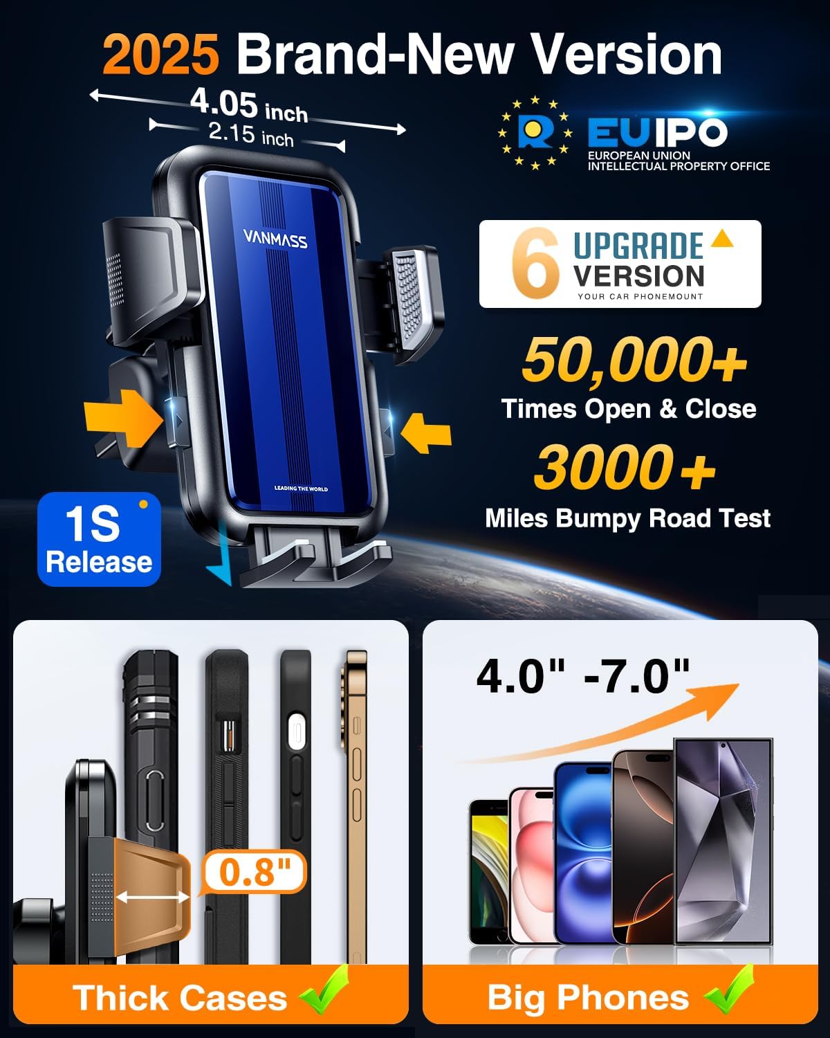 VANMASS True Upgrade [Top Military-Grade] Phone Holders for Your Car [Strongest Suction & Clip] Cell Phone Mount Dashboard Windshield Vent Stand Cradle for iPhone 16 Pro Max 15 14 13 Android, Blue