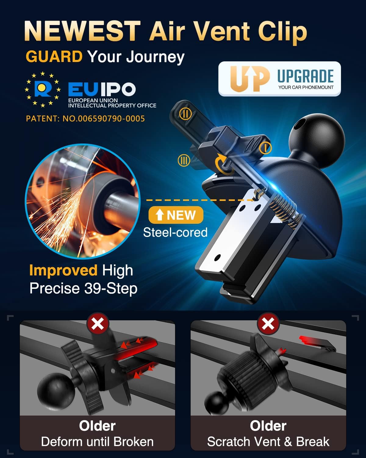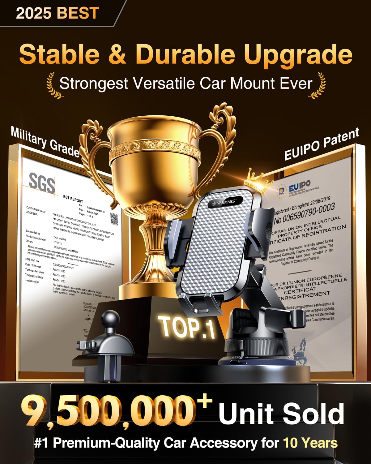 - 【Pro Version:VANMASS's Best Choice】VANMASS has been dedicated to car phone holder for 8 years, always leading the car holder industry in all aspects: safety, stability, durability, compatibility, multi-scene adaptability,climate friendly. The pro version mount enables the cutting-edge design team to create the best choice for customers- highest rating, most customers' preference, EU Intellectual Property Patent (No.007708805-0001), Military Grade Cert (No.GZMR220601855501), CP65/REACH/ROHS