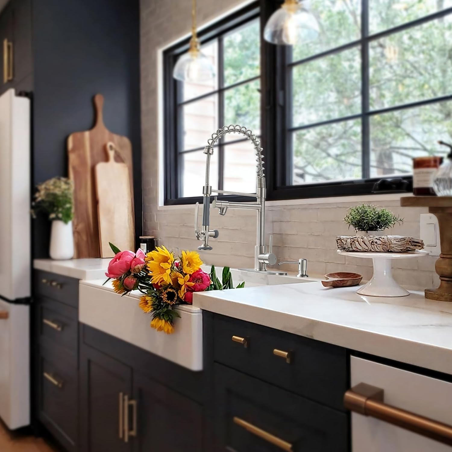- ENJOY GREAT FUNCTIONALITY: With a one-function kitchen faucet sprayer and a separate pot filler spout, this pull out faucet allows you to handle all types of tasks. The spray head and stream spout can swivel around 360 degrees for full sink access, and the pre-rinse faucet ensures high pressure while still saving on water.