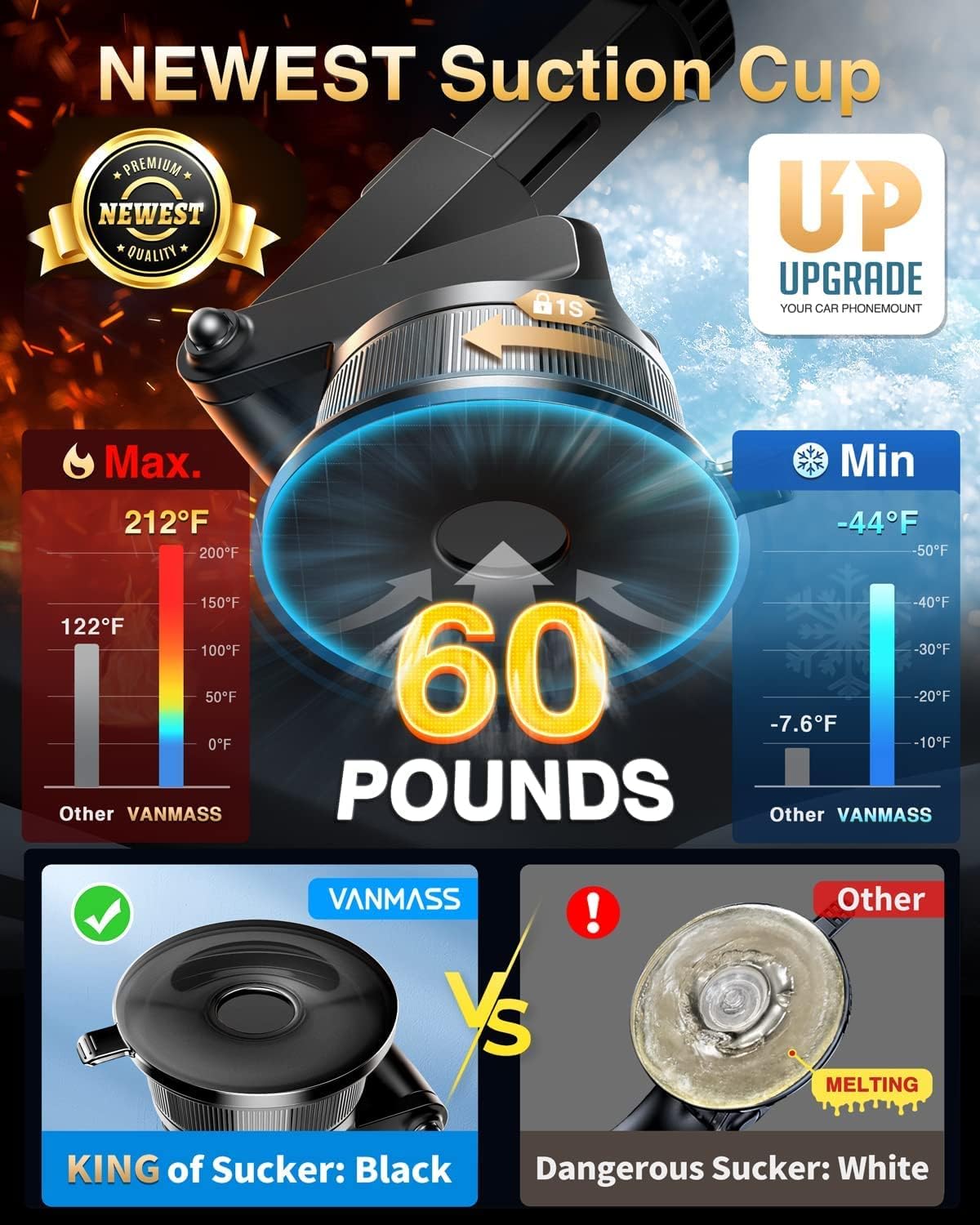 - 【🏆2025 Newest Rotary Mighty Suction Cup: Strongest Suction】Made of German materials, exclusive formula, one-piece molding rotary suction cup technology to ensure no melting or marks, UV and direct sun exposure resistance, -40~194℉,resistance. Maximize the adhesion of suction cups to ensure the best results: 60LB Suction - 50% higher than the traditional,especially for bumpy roads. (Note: NEW upgraded suction cup can be directly adsorbed to dash without pad! Pad is easy to damage the dashboard!)