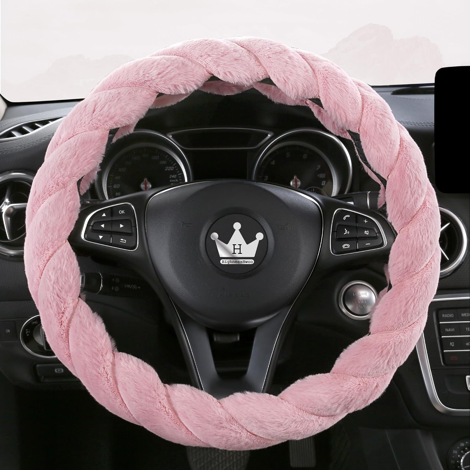 Luxury Fluffy Winter Car Steering Wheel Cover for Women Soft Warm Plush Cute Auto Accessories for Vehicle, Sedan, Universal, Fuzzy, Anti Slip, Pink, Standard Size, 14.75-15.15"