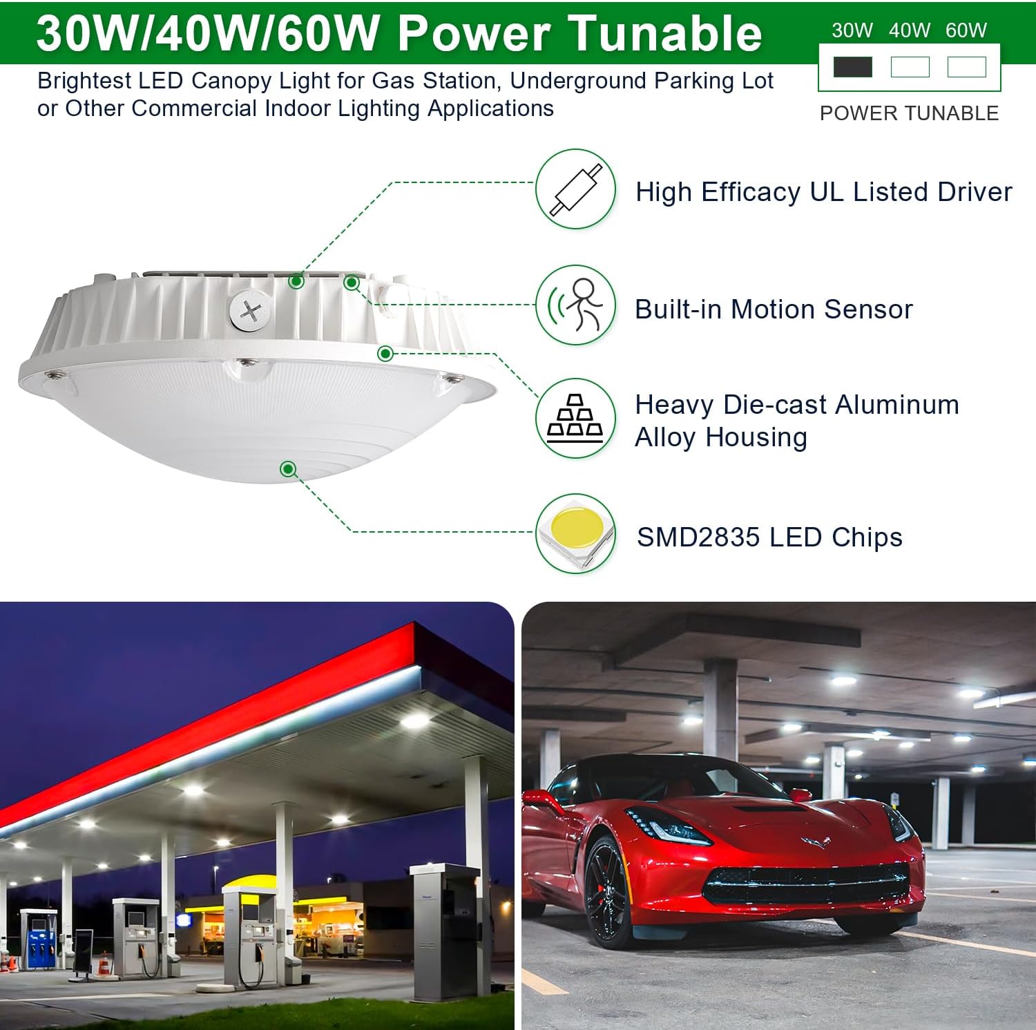 - đăLIGHT UP THE NIGHTă- 30W/40W/ 60W Selectable high quality lamp will provide you that bright and clear outdoor lighting you have been looking for! The beam angle boasts a wide 110 degree industry leading scope. Now you can safely enjoy beautiful nights playing games outside with your family and friends. As an electrician or contractor, you can impress your clients with one of a kind, state of the art lighting! This canopy light is so efficient that it can easily reach up to 135lm/W