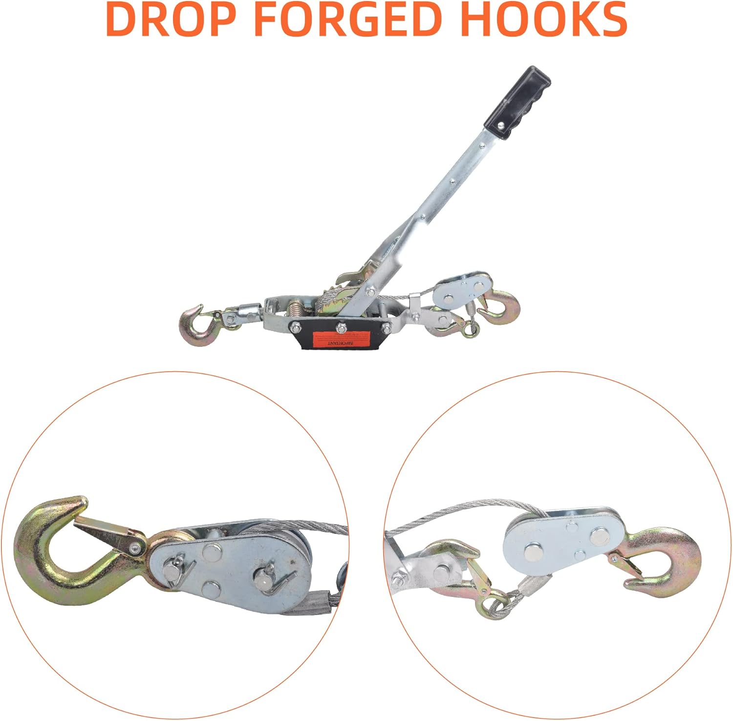 - POWERFUL DESIGN: New And Ioproved Larger Handle For Extra Leverage. Thick Body Frame, heavy Duty Cable With Strong Alloy Hooks. Solid steel body offers durable and long-lasting performance; Equipped with drop-forged steel safety hooks with a spring latch, Self-closing safety latch hooks stay connected; Features a powerful hand-crank ratchet action and an automatic notch-at-a-time let-down release.