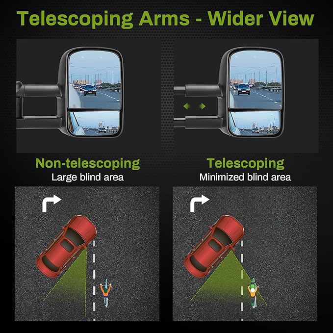 - Telescoping & folding:it can be manual extended to help you identify vehicles and surroundings that might be in a blind spot,folding can better protect the mirrors