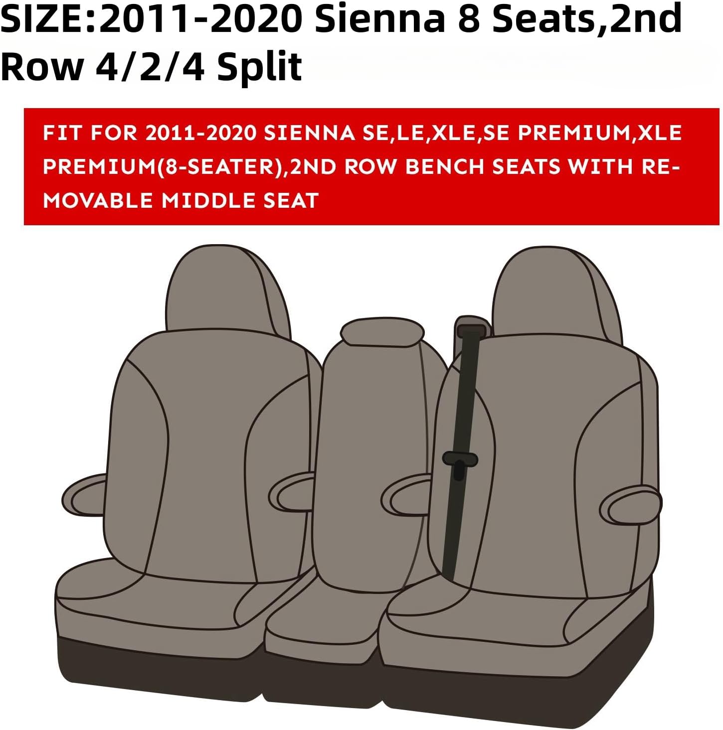 - (Custom Fit Design) Perfectly tailored for a glove-like fit, providing a seamless, smooth look that enhances your Toyota Sienna's interior. Suitable for Toyota Sienna 2011-2020,2nd Row 4/2/4 Split,8 Seats models. Refer to the second seatbelt diagram to choose the right Seat cover. Please ontact us if you're unsure about compatibility before ordering.