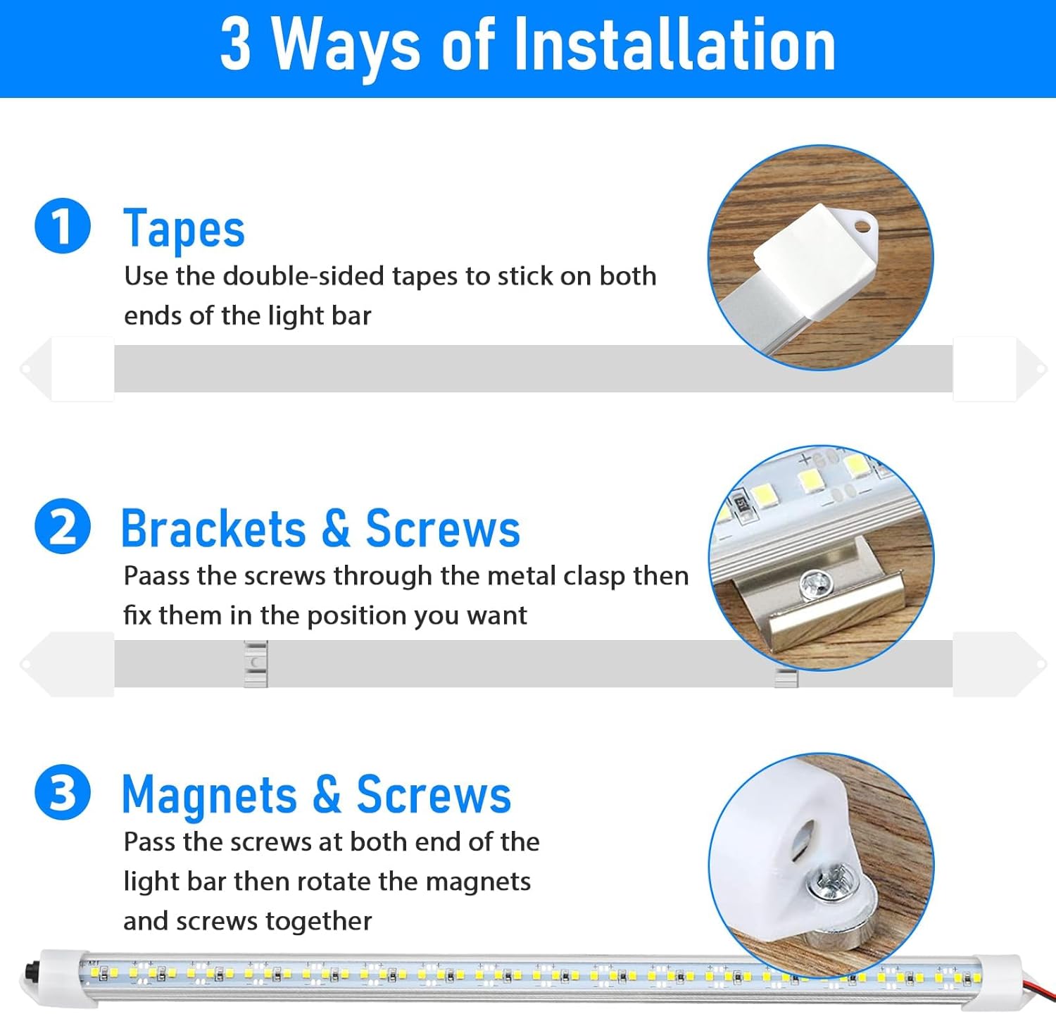 - Package Included: 4 x 12V LED Interior Light Bars, 2 x ON/Off Switches, 2 x Wiring Harnesses, 4 x Magnets, 8 x Screws, 4 x Metal Brackets, 4 x Strong Adhesive Tapes