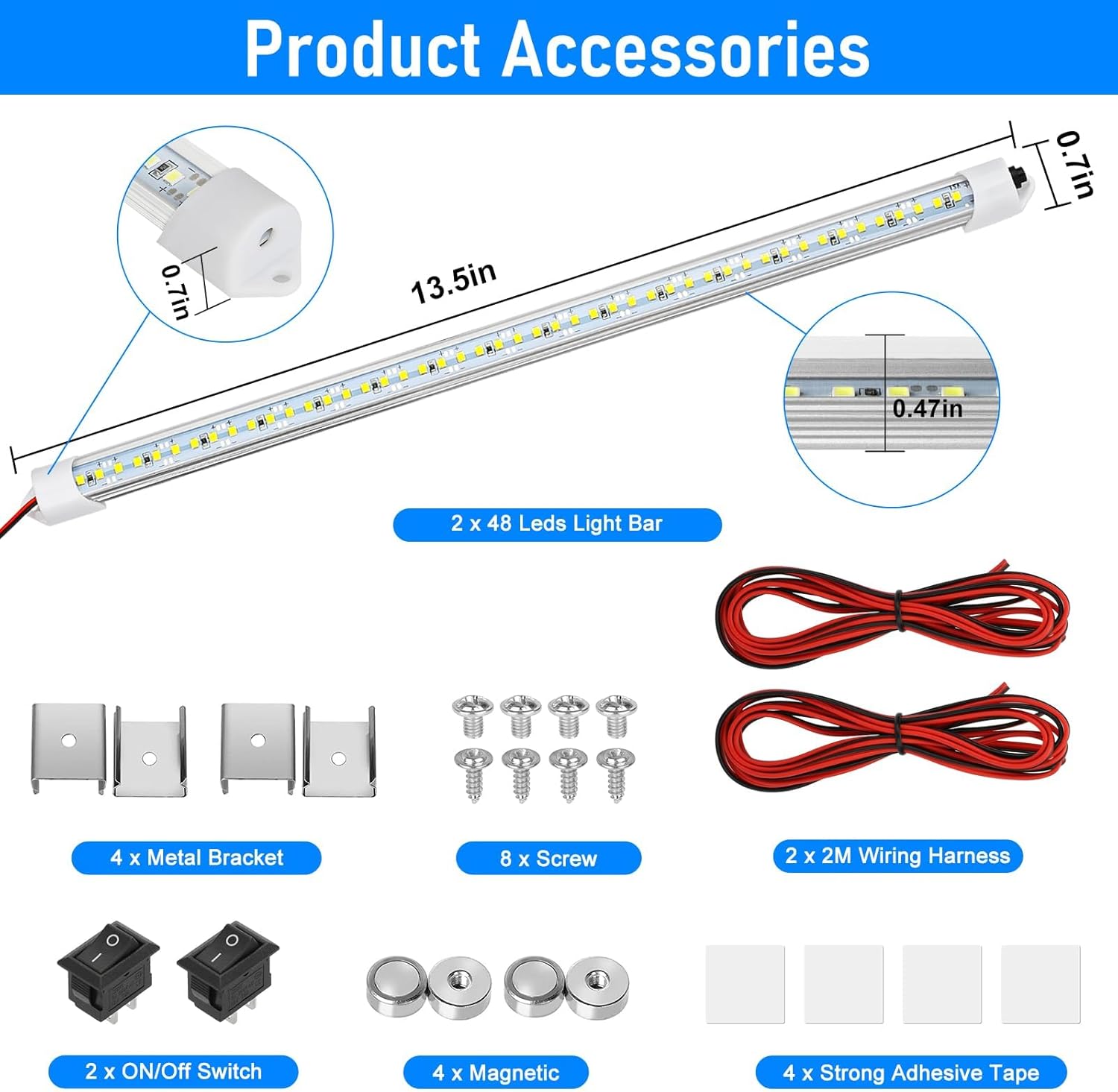 - Cozy & Bright: Each 12V LED light bar provides 700LM 6500K white light, ideal for private spaces, cooking, reading, and document viewing. Suitable for cars, trailers, RVs, vans, boats, trucks, and more