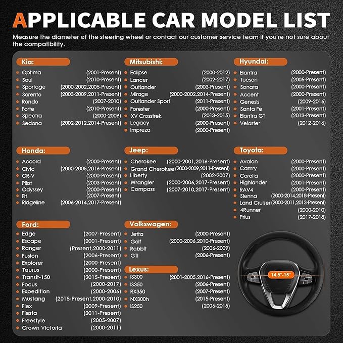 - WIDE APPLICATION: Featuring a universal size, HOTOR leather car steering wheel cover suits car steering wheel with a diameter of 14.5 to 15 inch(about 37 to 38cm). It's applicable to most cars like sedans, SUVs, and RVs.