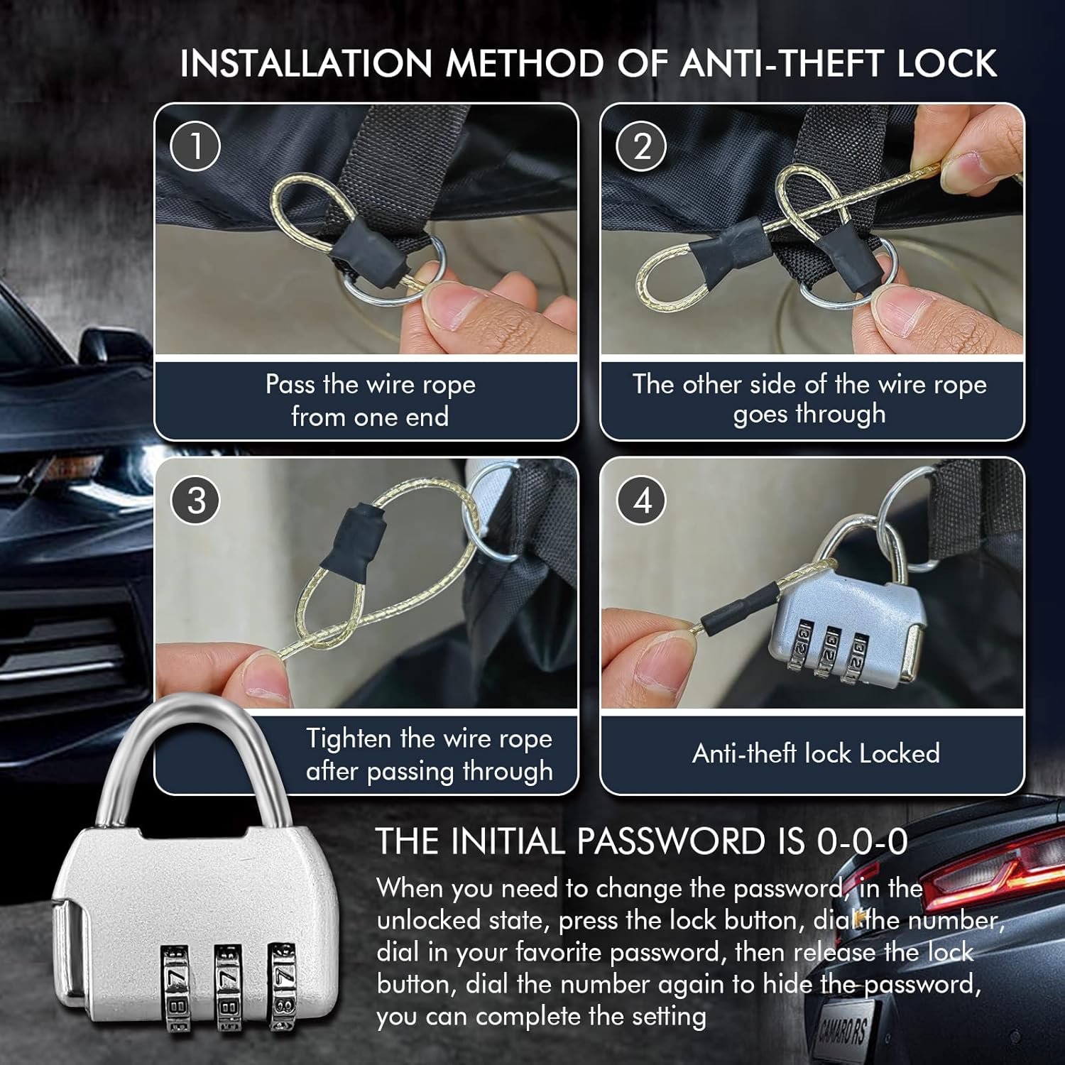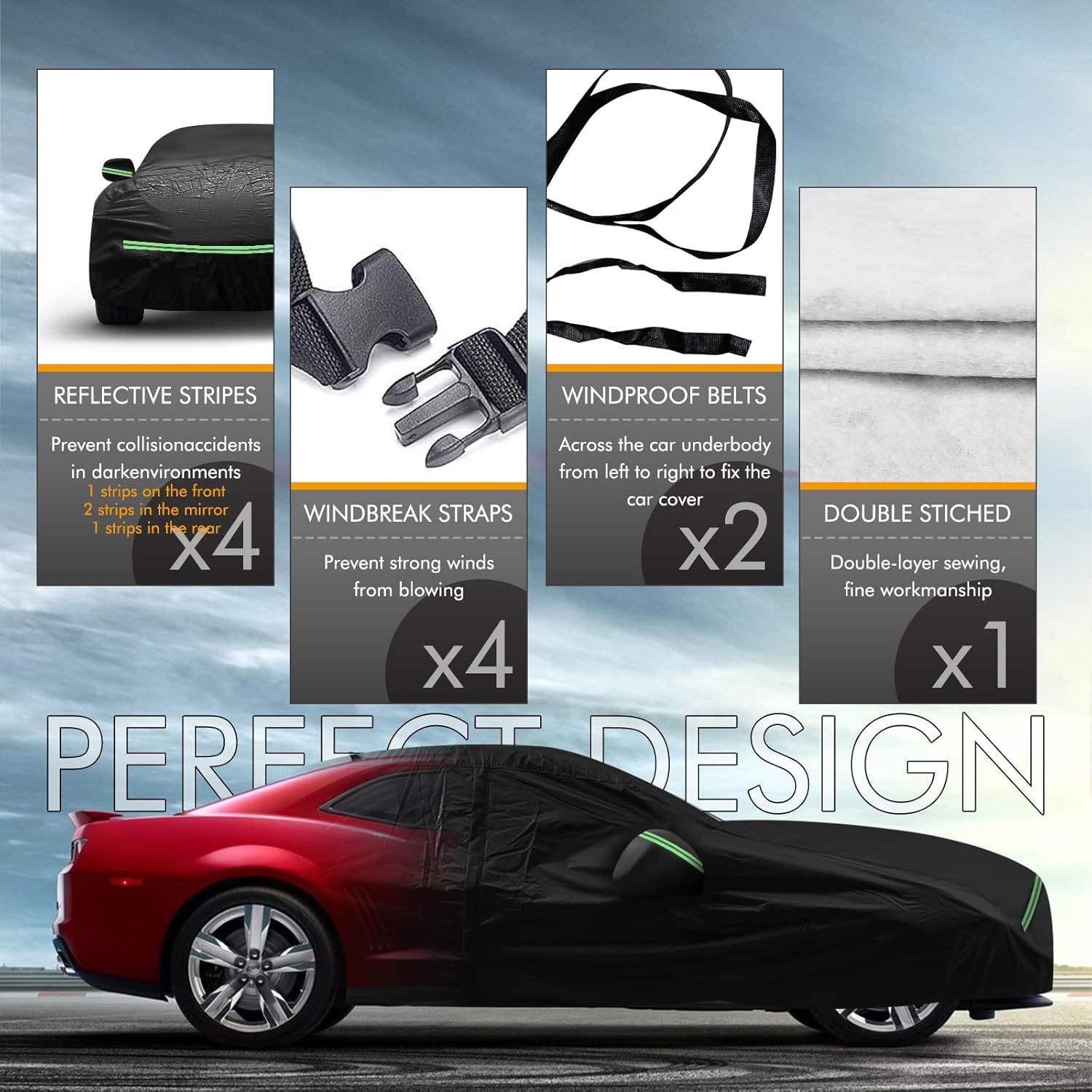 - ðãUpgrade Windproof Designãâ A windproof fixed buckle pass through the middle of the car for easy fixing; â¡2 windproof belts at the front and rear; â¢4 straps to tie the cover to the four wheels; â£Elastic band at the bottom can easily adjust the size of the cover; â€Double stitching ensures that the cover will not tear easily, making it more durable; â¥The included safety latch secures the cover. Multiple upgraded designs keep your protective cover from being blown away even in strong winds.