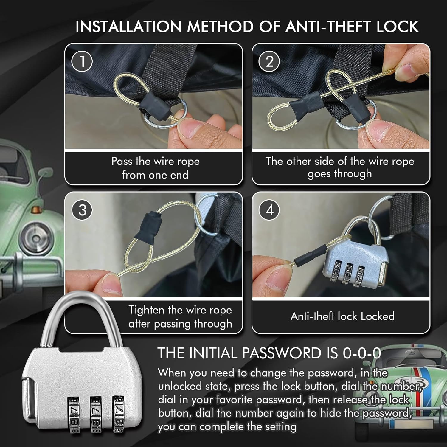 - ðãUpgrade Windproof Designãâ A windproof fixed buckle pass through the middle of the car for easy fixing; â¡2 windproof belts at the front and rear; â¢4 straps to tie the cover to the four wheels; â£Elastic band at the bottom can easily adjust the size of the cover; â€Double stitching ensures that the cover will not tear easily, making it more durable; â¥The included safety latch secures the cover. Multiple upgraded designs keep your protective cover from being blown away even in strong winds.