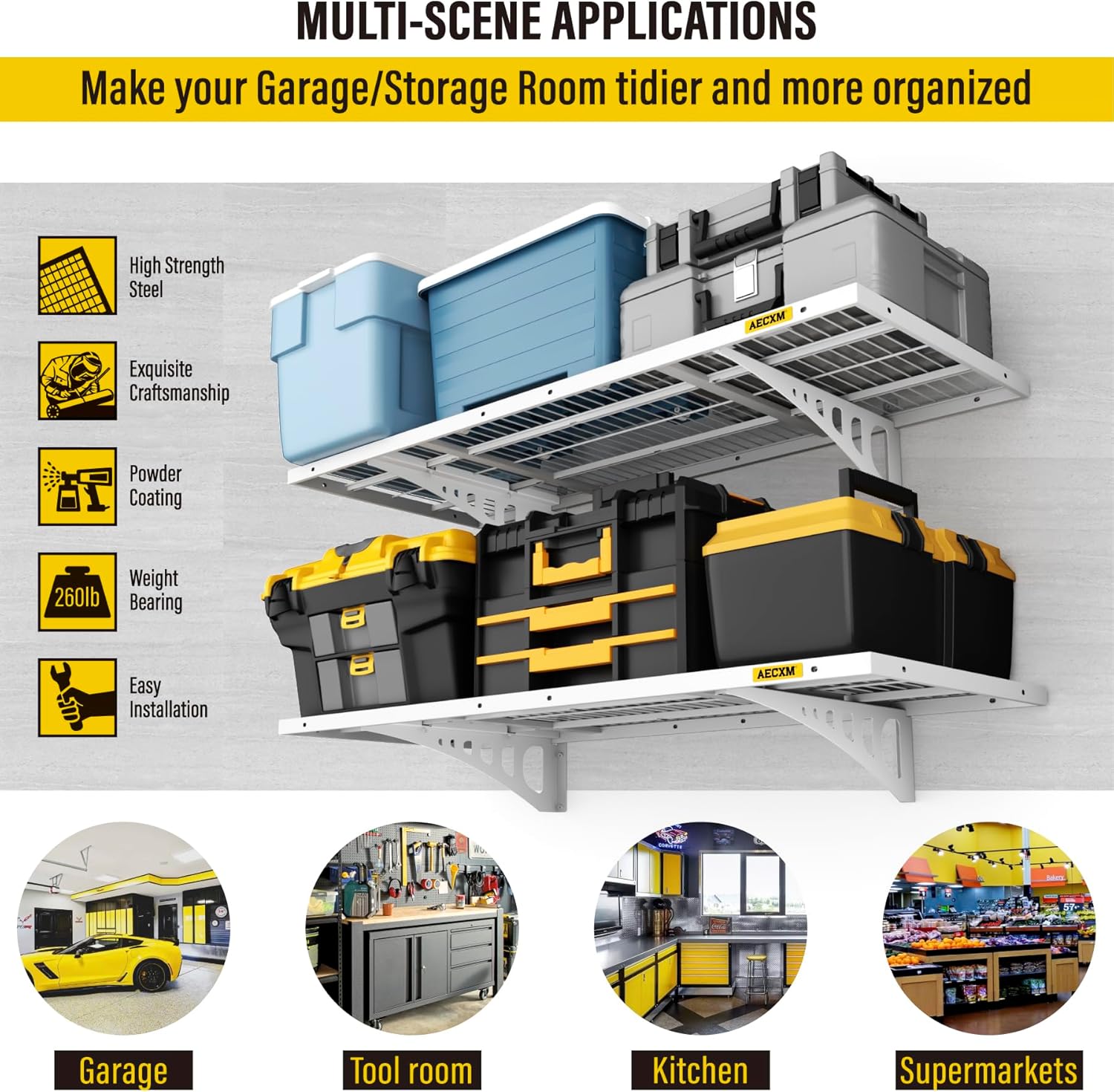 - Premium Materials: Our garage shelving features a rectangular tube frame paired with thick welded wire mesh for superior strength. Finished with a fine sand-texture, high-temperature powder coating, it delivers a sleek, modern, and perfectly flat design