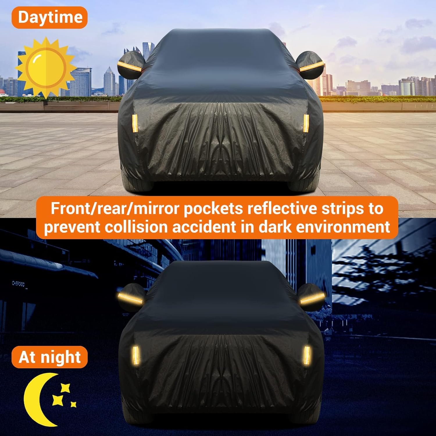 - 360°All-round Protection: Protect your vehicle from scratches and dents, sun, rain, snow, rain, frost, bird droppings, sand, dust, leaves, industrial pollution and more with a waterproof all-weather hail car cover. Black car cover SUV is stain-resistant and easy to clean, wipe the cover with a damp cloth and the dirt will slide off in no time.