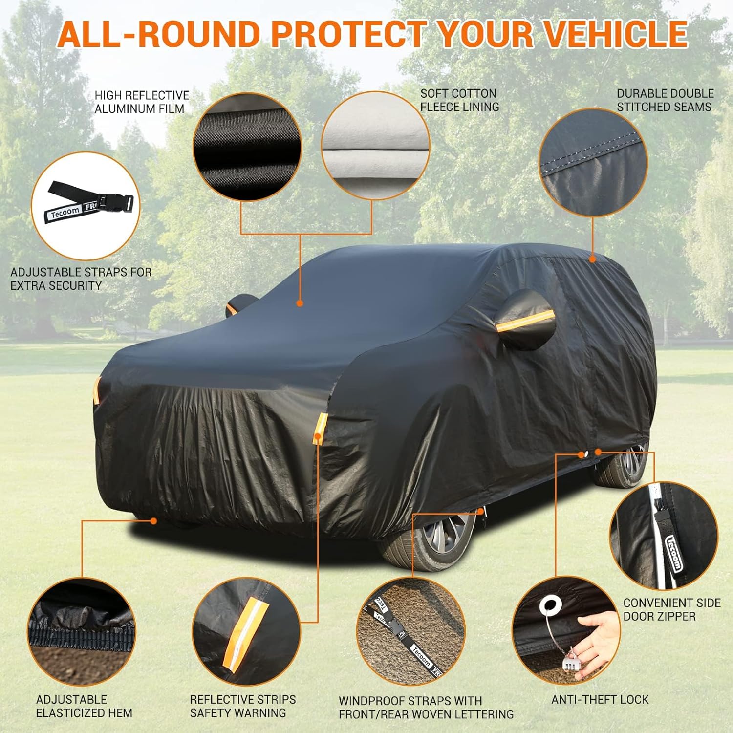 - 3-layers Premium Material: Tecoom car covers for automobiles is made of high-density 190T multi-layer thick composite material. 1. Sun and UV protection in highly reflective aluminum keeps your SUV from overheating while preventing fading and extending its life. 2. PE&PEVA 100% waterproof, rainproof, snowproof, hailproof. 3. Soft fleece lined fabric won't scratch paint.