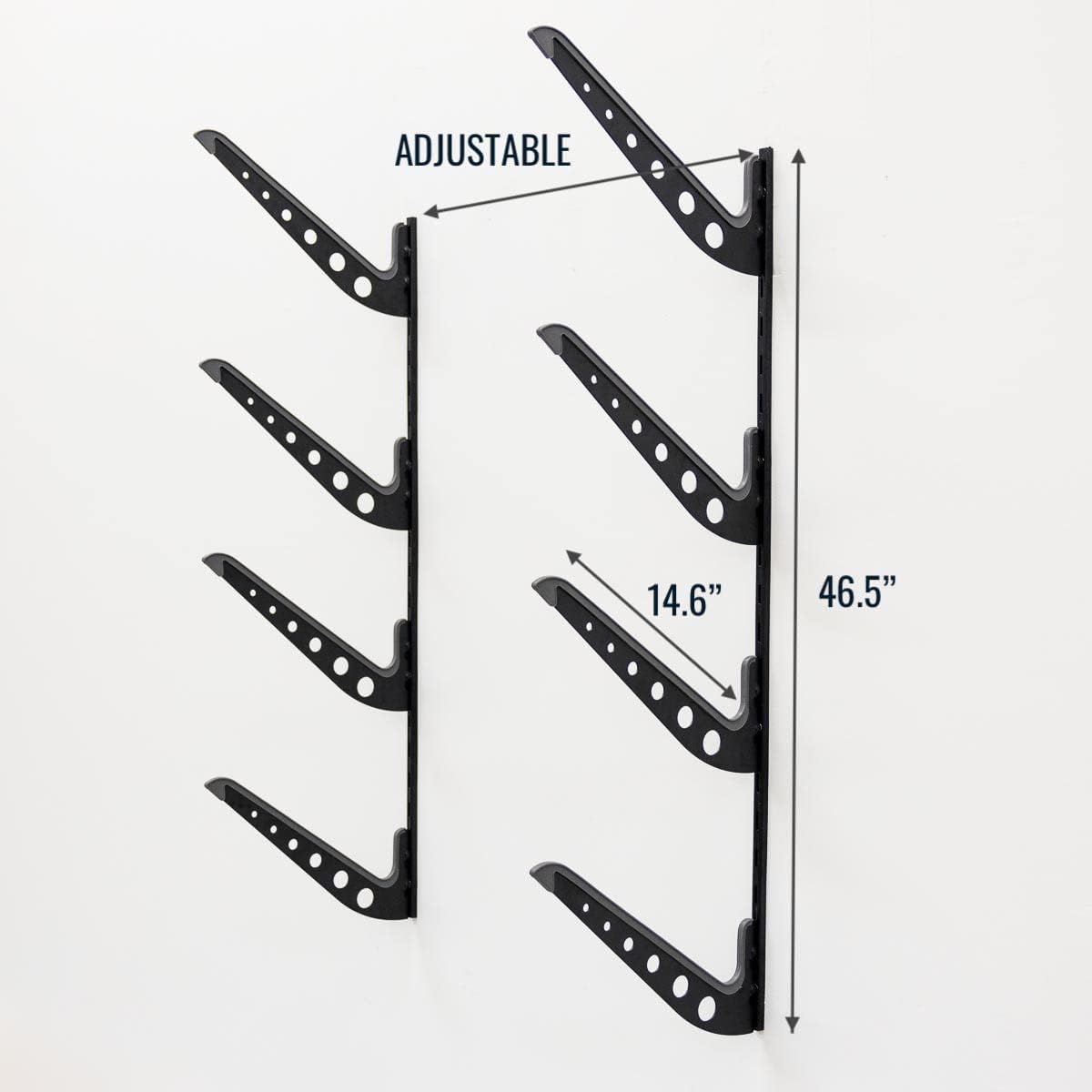 - Adjustable Levels: This rack system consists of 2 vertical tracks and 4 sets of rack arms. Mount the tracks to your wall parallel at whatever distance apart you require to fit the length of your gear. Then, insert the arms into the track's holes at the spacing up and down the track that you need. For even more storage versatility, hang your wetsuits, leashes, and other gear from the cutout holes in the racks' arms.