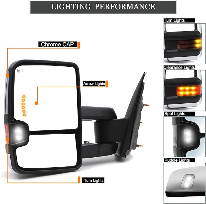 - ✨[Product Function ]: Power, Heated, LED Turn Signal Light, Arrow Signal On Glass, Auxiliary Light, Manual Folding, Manual Telescoping, Chrome Cap.