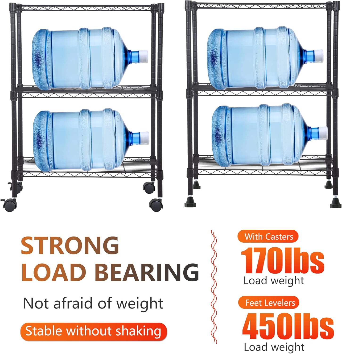 - ā [Strong bearing capacity] When the scaffold is equipped with foot nails, each layer can hold 150 pounds, with a total bearing capacity of 450 pounds. When the rack is equipped with movable casters, its total load is 170 pounds. The electrical rack in the kitchen can be used to place some commonly used living items without worrying about the deformation of the storage rack.