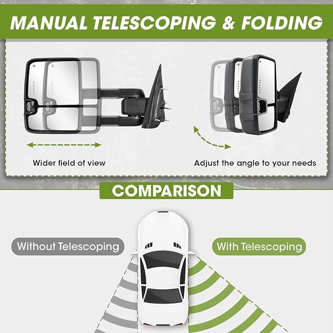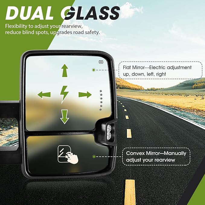 - Functions: SIZIOM tow mirrors offer a range of functions, including switchback dynamic & arrow turn signal lights, backup lamps, running lights, heated defrost, temper sensor on the passenger side, power-adjustable flat glass, manual-adjustable convex glass and manual telescoping & folding