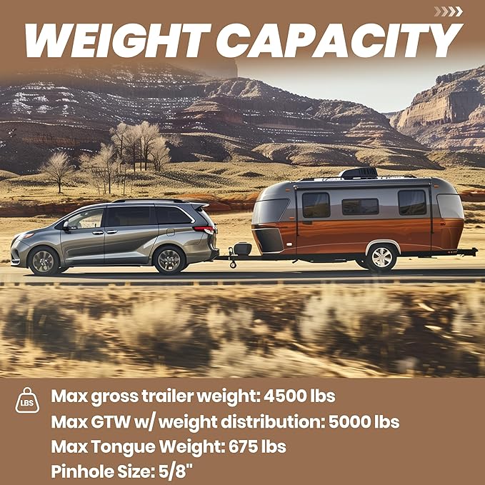 - Feature: Material: Steel; Color: Black; Finish:Powder Coated; Hitch Class: Class 3; Receiver Size: 2" Receiver Tube; Max gross trailer weight: 4,500 lbs; Max GTW w/ weight distribution: 5,000 lbs; Max Tongue Weight: 675 lbs. Pinhole Size: 5/8"