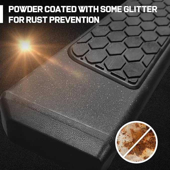 - MATERIAL: The Running Boards Are Made Of Heavy Dudy Carbon Steel With Dual-stage Textured Black Powder Surface. The Steps Can Withstand Rain Erosion And Have Rust And Corrosion Resistant. Powder Coated with Some Glitter for Rust Prevention While Making Your Running Boards Look More Stylish and Outstanding.