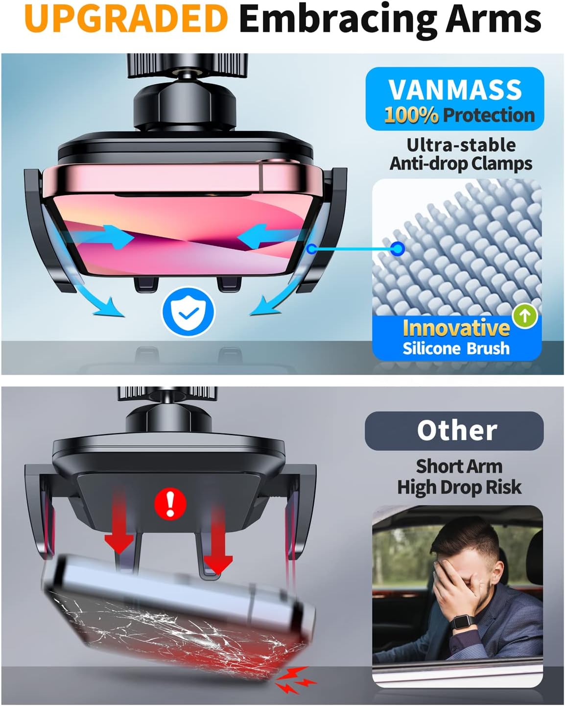 - [Big Phones & Cases Friendly] The latest upgraded flagship version of VANAMSS phone holder features an adjustable clamp arm and a retractable base, along with tooth-shaped silicone grips. This ensures compatibility with 99% of smartphones and protect your phone will never slip or fall off