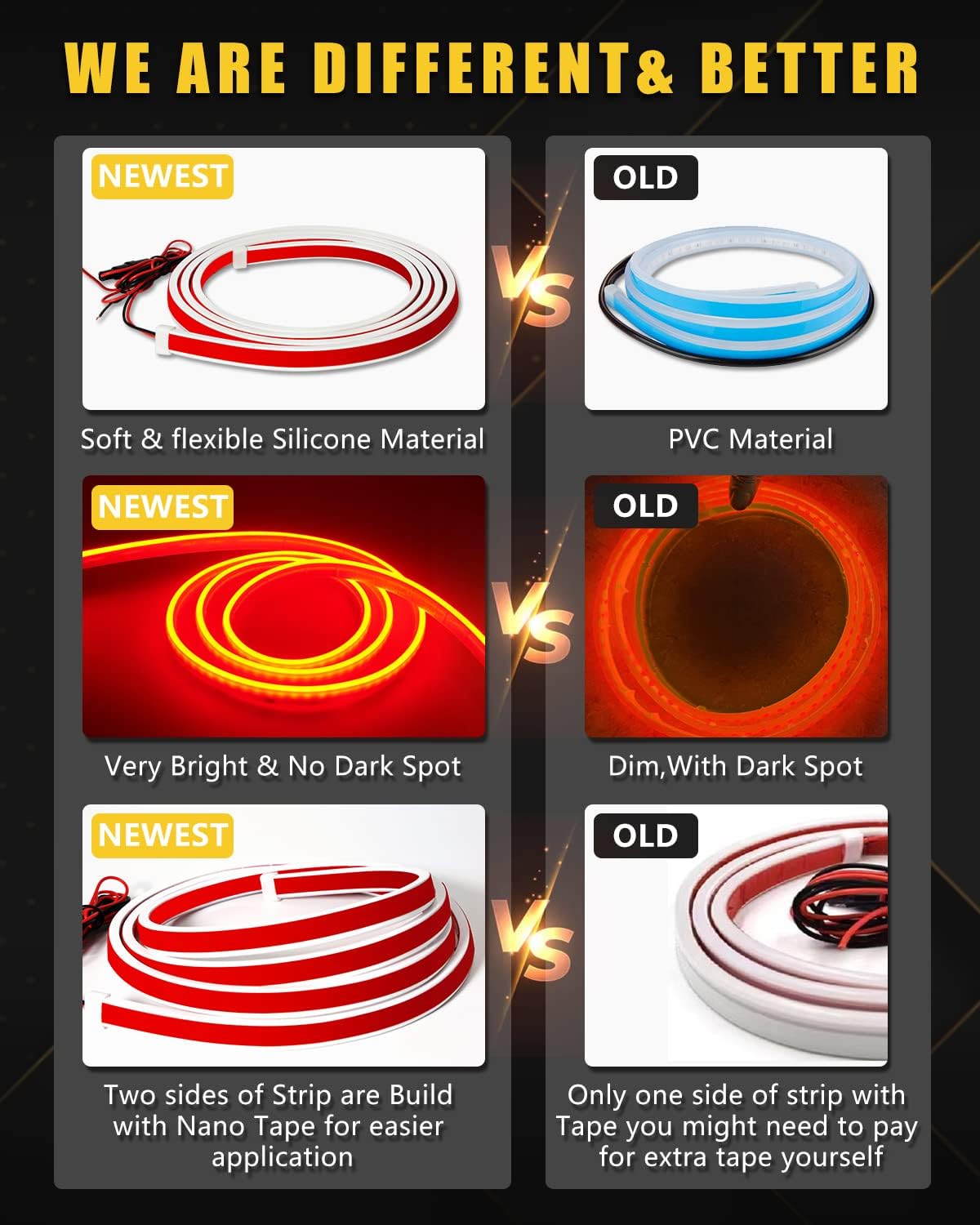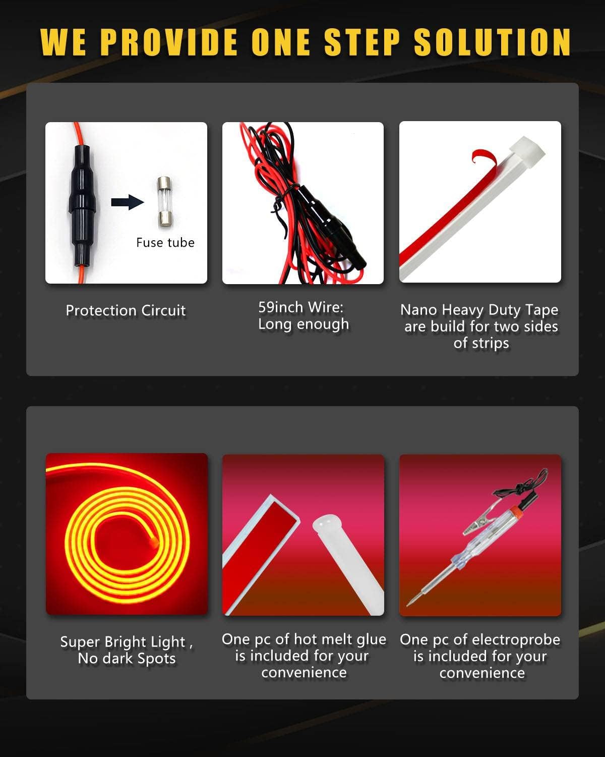 - ăFuse ProtectionăThe Car led strip light is made of soft silicone with heavy duty Nano Tapes on both sides,Super Bright,No dark Spots.Short circuit protection to enhance the safety.