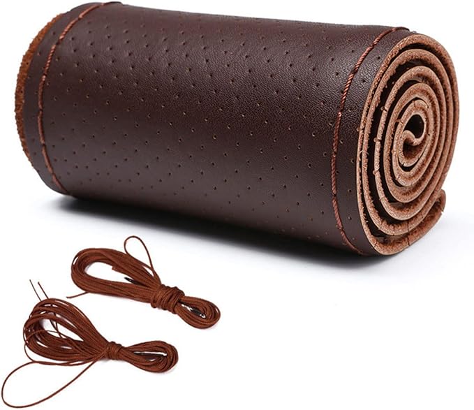 DEEYOTA Car Steering Wheel Cover Universal Fit Round Stitch Steering Wheel Wrap Thin PU Leather Steering Wheel Cover Sewn on 15" Car Wheel (Coffee)