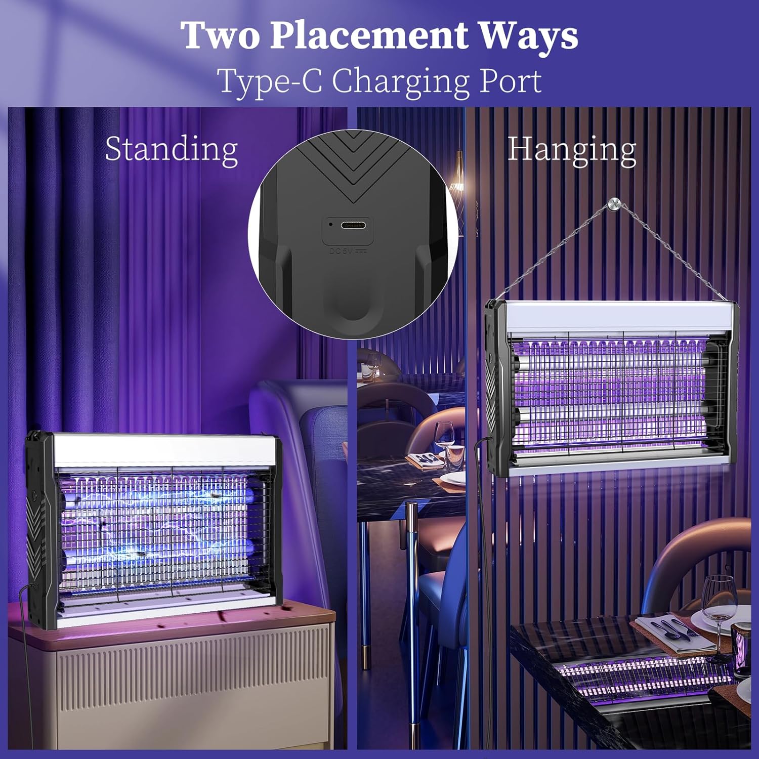 - Easy to Use: Simply plug in the USB interface and start using. On the right side of the bug zapper are the power button and USB port. Additional USB cable of the bug zapper is white, about 59in/1.5m long. Note: Please place the mosquito trap on the flat surface. If you want to hang the bug zapper on the wall, please make sure the chain has been mounted.