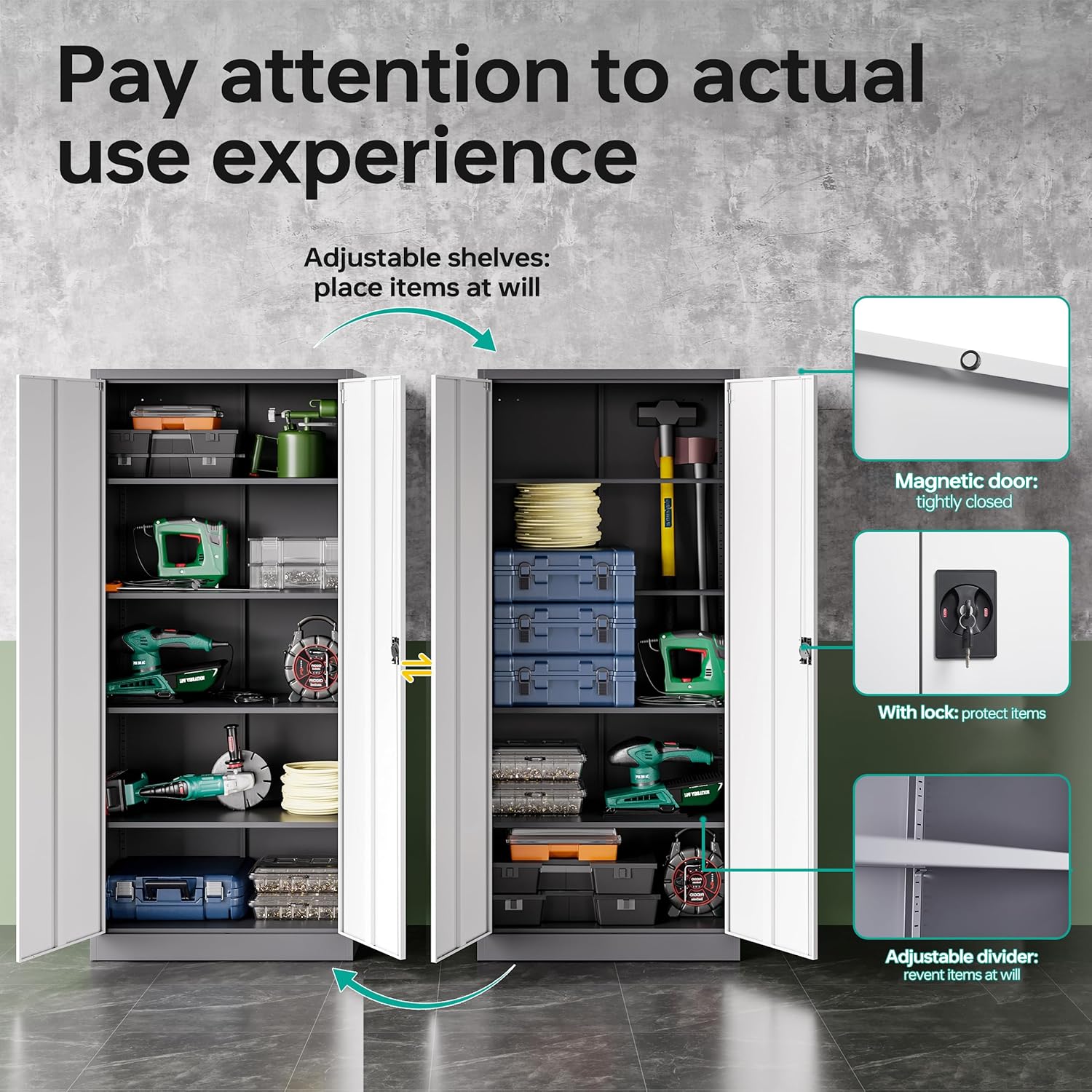 - ăLarge Capacityă: Garage storage cabinet with 4 adjustable shelf to meet your different needs for placing items, shelf and door lock can highly protect items from temperature, dirt and dust