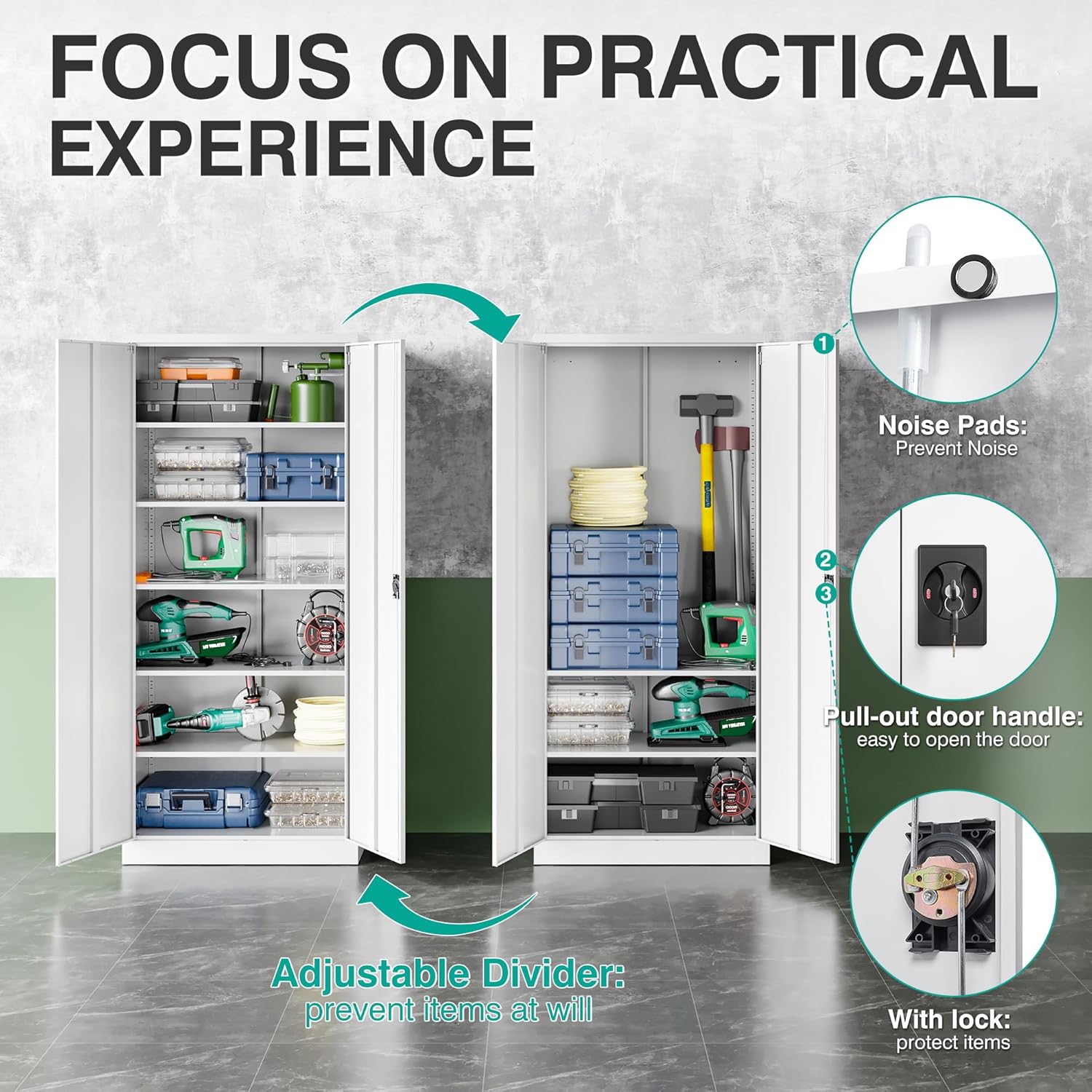 - 5pc Adjustable Shelf: Garage storage cabinet with 5 adjustable shelf to meet your different needs for placing items, shelf and door lock can highly protect items from temperature, dirt and dust