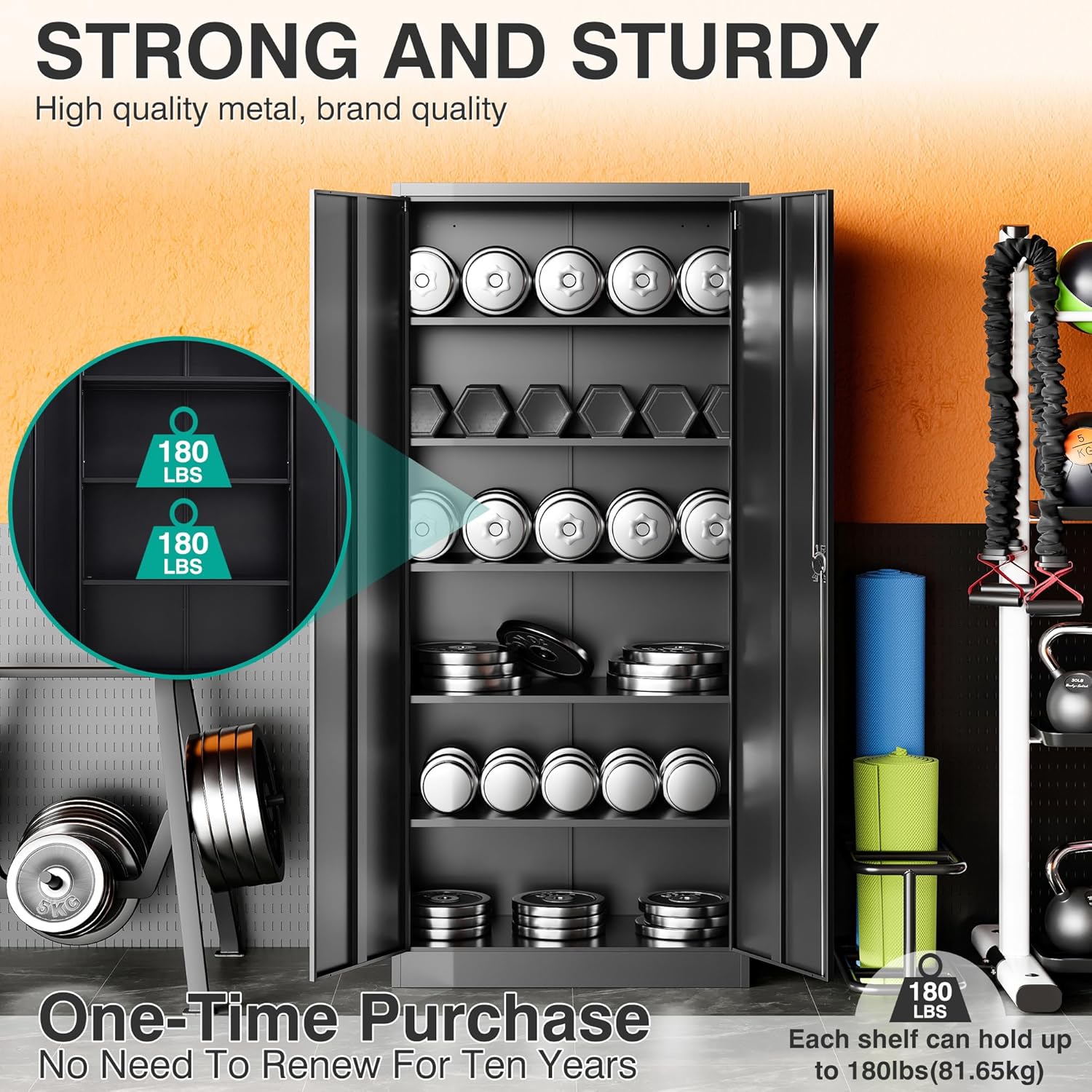 - Large Storage Capacity: Large storage cabinet overall size: 70.87 inch×31.5 inch×15.7 inches (H x W x D), total weight: 75 lbs. This metal storage cabinet has a strong and durable metal frame with excellent load-bearing capacity, allowing you to store enough items. Weight Capacity: 900 lbs total, the lockable storage cabinet has 5 adjustable shelves, each shelf holds: 180 lbs
