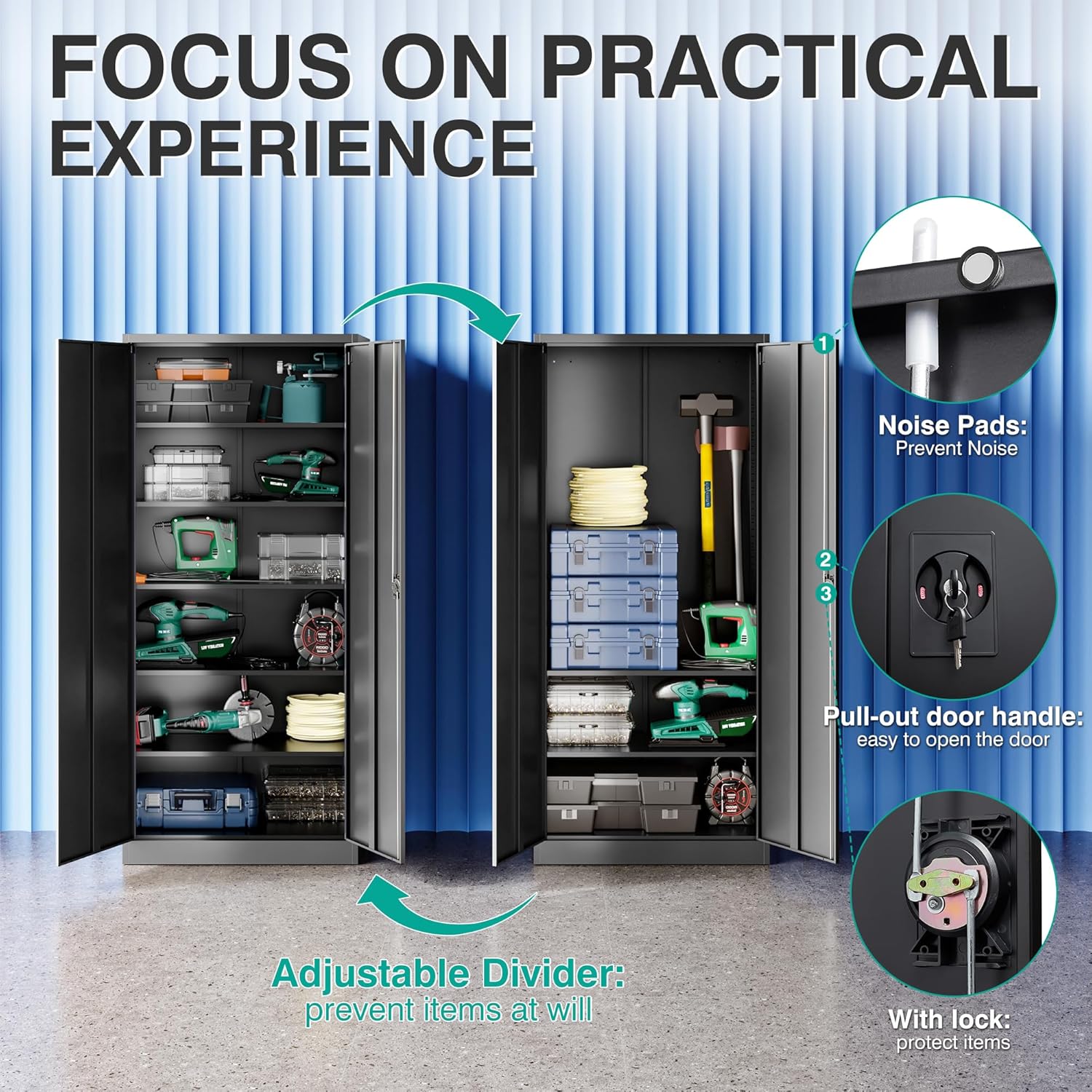 - Upgraded 5pcs Adjustable Shelf : The garage cabinets storage uses 5 adjustable shelves. You can move to the desired height by adjusting the shelf pegs according to the size of the things. so that you can divide the office storage cabinet space distribution. You can also design garage storage flexibly and remove the shelves for more standing room