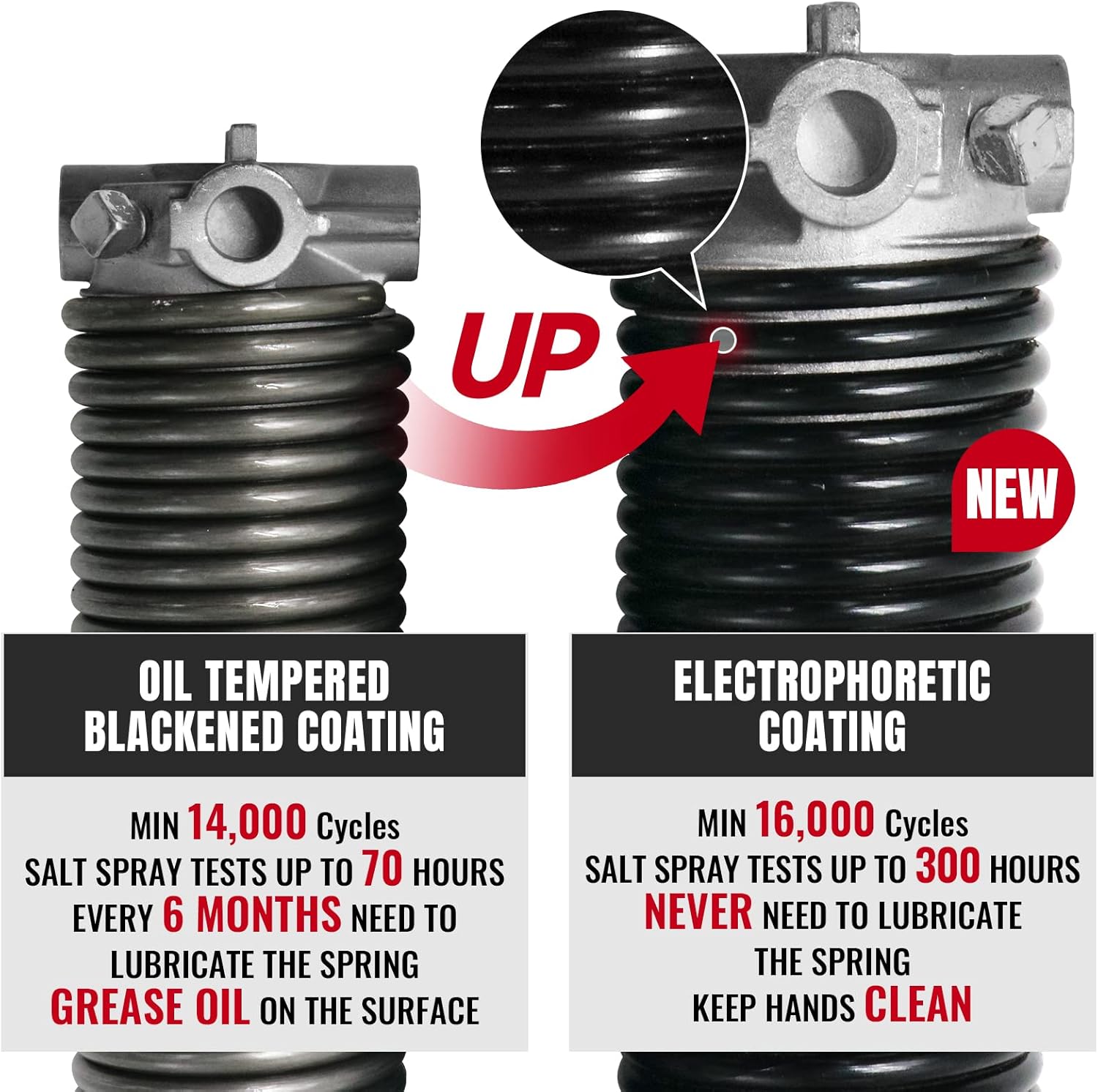 - HIGH QUALITY : Made of heat-treated professional spring steel coils with aluminum cones to make sure they are extremely heavy duty. The latest electrophoretic coating technology provide excellent corrosion proof performance and superior abrasion proof performance. Salt spray tests up to 300 Hours, and Minimum 16,000 Cycles. NEVER need to lubricate the spring, keep hands clean during installation.