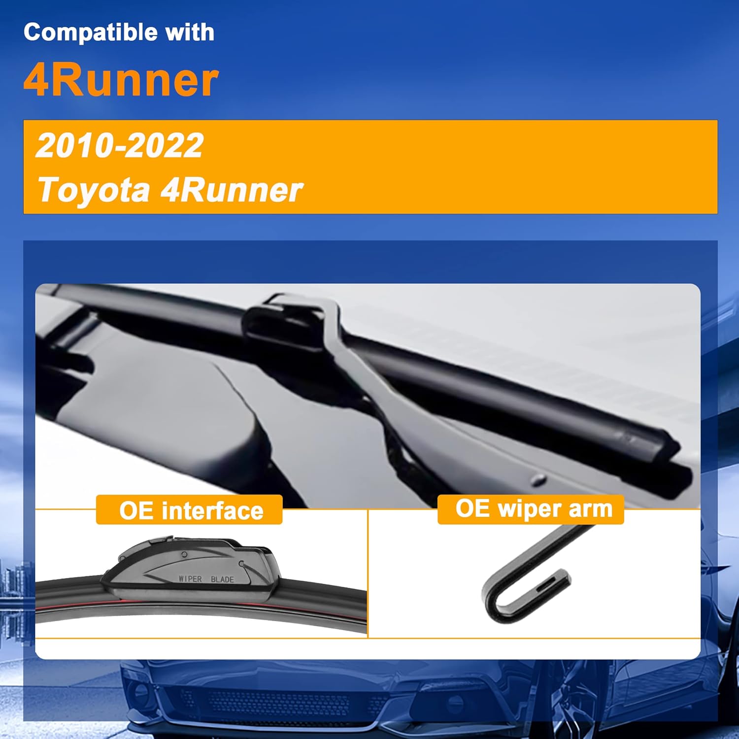 - {FITMENT}: Replacement for 2010 2011 2012 2013 2014 2015 2016 2017 2018 2019 2020 Toyota 4Runner front rear windshield wiper blade set.