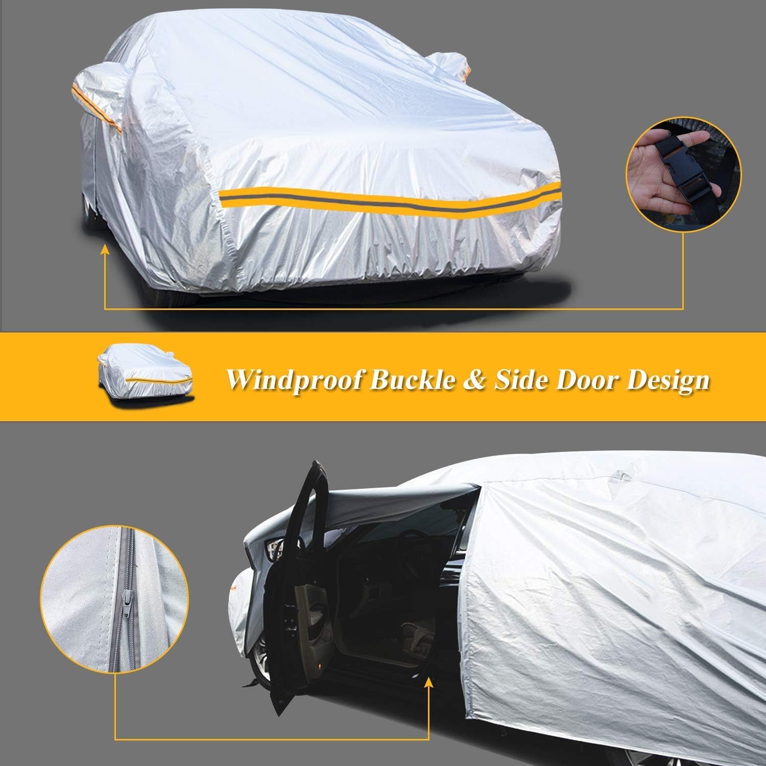- šćUnique DesignćCar covers for automobiles all weather waterproof.1.Zipper on the driver's side:Convenient to get out things;2:Long fluorescent Light Strips:Protect your car at night;3. Large Mirror Pocket:Fashion appearance.4.A generous storage bag allows easy-stuff storage.
